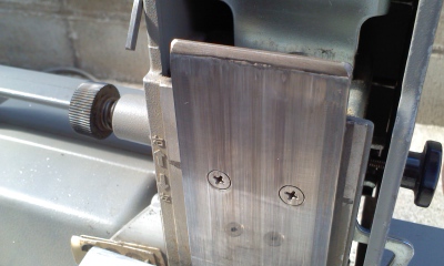 皿ネジ止めし、3mm厚のアルミのアングル材で作ったワークレストをつけています。