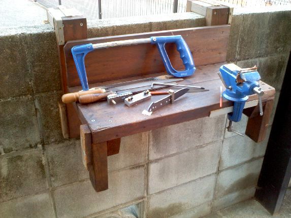作業台は画像のように使うときに塀に引っ掛けて使います。